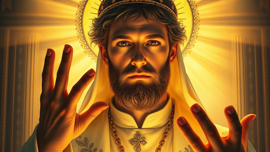 A mksks-style full portrait of a sacred priest bathed in holy light, showcasing ultra-quality visuals with intricate details. The priest has perfect anatomy and a beautiful face, set in a magical, divine ambiance with golden hues enveloping the scene. The background features a canvas frame with a 3D effect, enhancing the visual depth. Unique color choices create an ethereal atmosphere, with subtle, creative mutations adding to the mystique: extra fingers and hands with a surreal yet captivating allure. The portrait maintains an air of otherworldly beauty amid scattered, intentional imperfections—a touch of the unusual but still compelling, drawing you in with its divine and stunning presence.