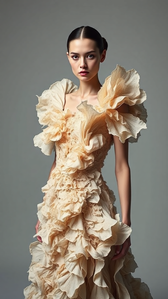 A model adorned in an avant-garde haute couture ensemble, featuring intricate Iris Van Herpen-inspired structures, presented in a striking Vogue editorial style. The photo captures sharp focus with dynamic lighting, emphasizing the dress's elaborate textures and flowing forms, set against a minimalist background to enhance the bold artistry.