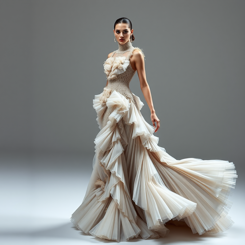 A model elegantly posed in an avant-garde haute couture gown, inspired by Iris Van Herpen's intricate and structural design, captured in a Vogue editorial style. The image features sharp focus and dynamic lighting, highlighting the dress's complex textures and flowing shapes, set against a minimalist background to accentuate its artistry.