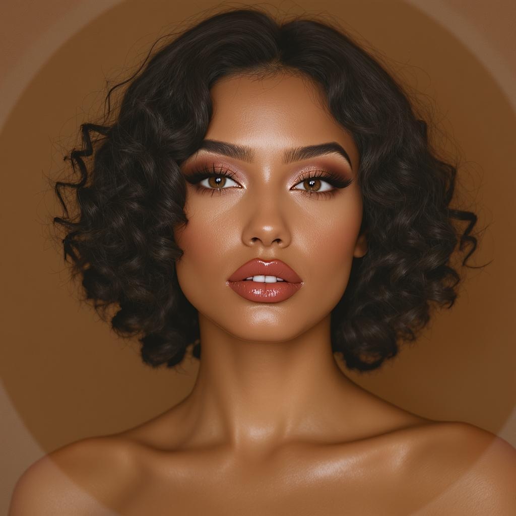 A model with curly black hair, styled in the daz3d fashion, is captured in a close-up with a hazy, wavy essence. The image takes on a warm brown tone and is framed in a tondo style reminiscent of ferrania p30. The skin is smooth, devoid of freckles or imperfections, with an artistic chaos level of 55, presented in an aspect ratio of 1:2. Personalized touches are subtly woven throughout, maintaining a stylized feel with an elegance factor of 750, reflecting version 6.1.