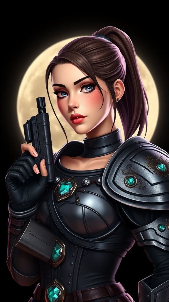 A modelshoot style portrait featuring a woman with the beautiful face of Tifa Lockhart, adorned in armor with intricate gems, reminiscent of Warhammer 40k’s Adepta Sororitas. Her highly detailed face is complemented by a blush and pink eyeshadow, and her hair is styled in a sleek ponytail. She stands confidently, holding a gun, in front of a full moon, under cinematic lighting that emphasizes chiaroscuro contrasts. Her armor showcases intricate, ornate details, and the composition captures a fashion portrait essence. The presence of a canvas frame adds artistic depth. The scene, though inspired by cartoon and 3D elements, maintains a realistic quality, avoiding exaggerated or distorted features, presenting a harmonious and visually appealing depiction.