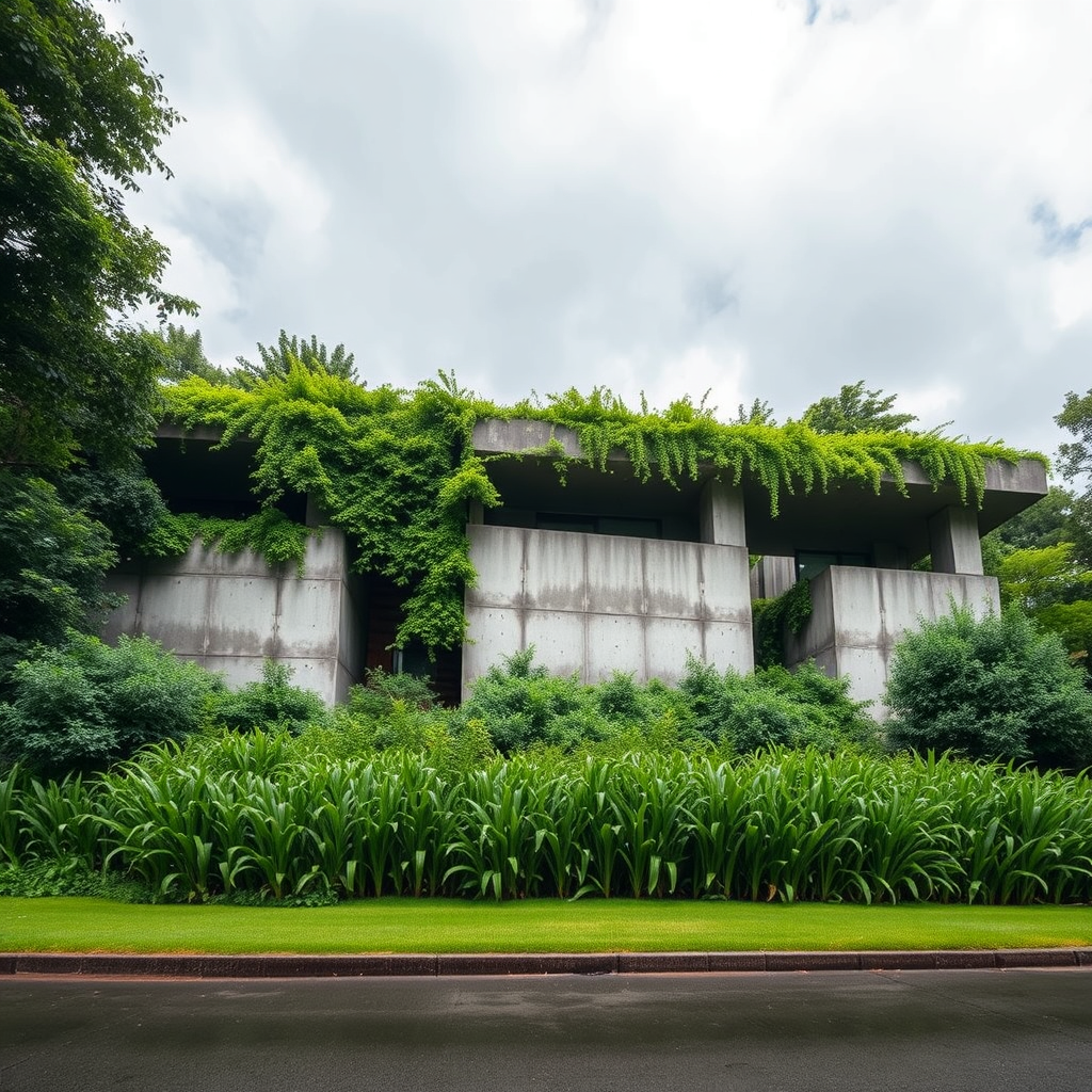 A modern, brutalist-style residential structure enveloped by lush greenery, featuring raw, exposed concrete with large, rectangular, and cantilevered slabs. The concrete sections exhibit sharp, clean lines and varying depths, enhancing the sense of form. Greenery is seamlessly integrated into the design, cascading over the edges, harmonizing nature with an industrial aesthetic. Captured with a high-resolution camera using a wide-angle lens, the image captures the full width of the structure and the surrounding landscape, maintaining depth and scale. The lens is set to a small aperture for a deep depth of field, ensuring both the building and the foreground greenery are sharply focused. The composition is symmetrical, with the building centered in the frame. It is aligned horizontally, occupying the middle of the image, with greenery filling the bottom section and a partially overcast sky at the top, creating a balanced, layered effect. The diffuse light highlights the concrete texture while maintaining a serene atmosphere, and the wet pavement in the foreground subtly reflects light, adding texture and anchoring the image. Incorporate bursts of wildflowers among the greenery, adding vibrant pops of color to contrast with the concrete.