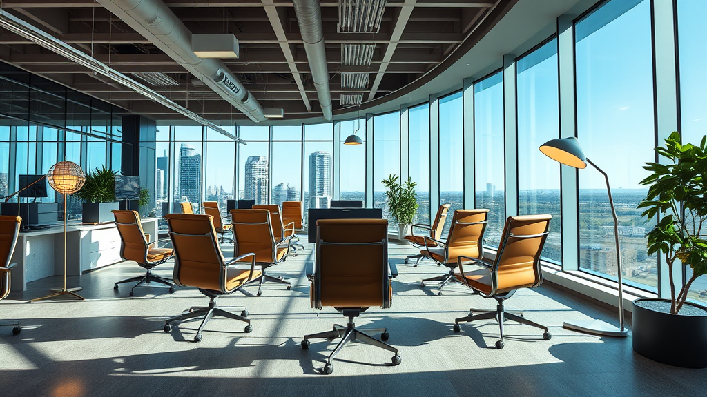 A modern, expansive office space featuring panoramic frontal views, furnished with ergonomic Herman Miller Embody chairs and illuminated by sleek Artemide Tolomeo Mega floor lamps. The scene is captured using a Canon EOS R5 camera, paired with a 35mm f/1.4 lens, showcasing a harmonious blend of natural daylight and ambient LED lighting for a vibrant yet relaxed atmosphere.
