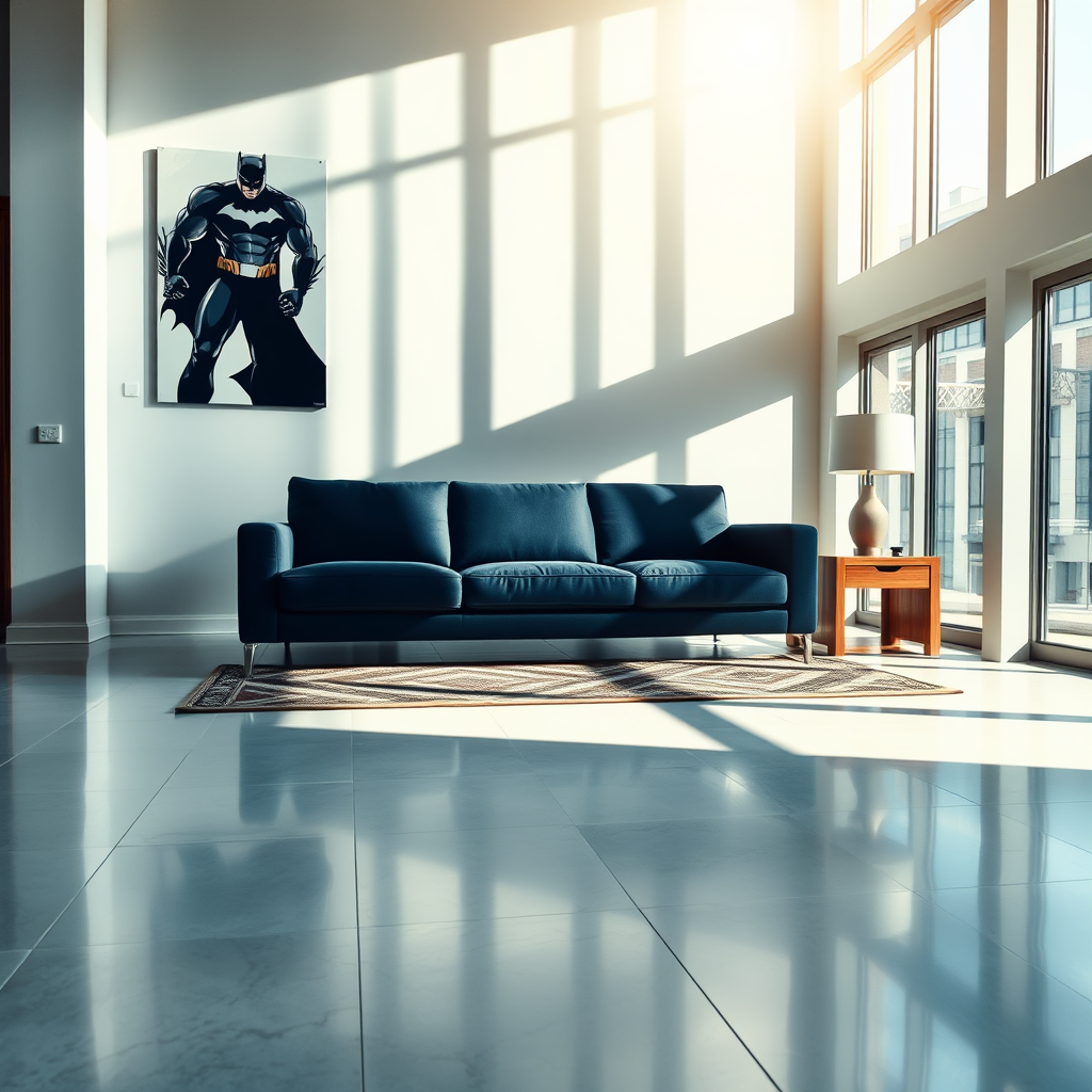 A modern lounge bathed in morning light, showcasing a polished tile floor contrasted by a patterned rug. On the wall, a striking illustration of Batman adds an edge to the space. Dominating the room is a sleek, dark blue sofa set, its deep hues beautifully complementing the sunlight streaming through large windows. Next to the sofa, a sophisticated wood side table holds a minimalist lamp. The entire setting exudes a raw, yet refined atmosphere, with ultra-high-definition clarity enhancing every detail.