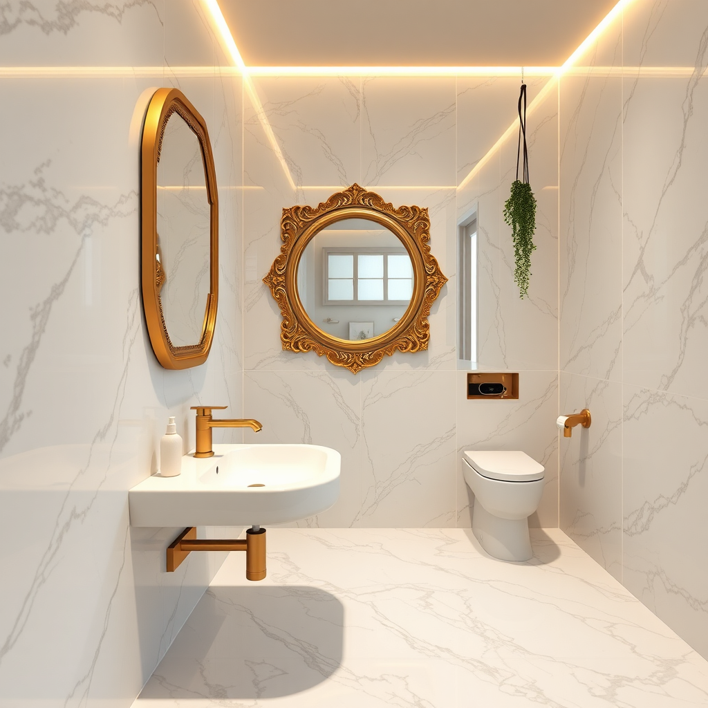 A modern luxury bathroom interior is viewed from the front, showcasing an elegant white marble sink paired with a sleek matte gold faucet. A wall-mounted toilet in pristine white ceramic complements the room's lavish style. A large mirror with a gorgeous gold filigree frame reflects the opulent decor, enhancing the sense of luxury. The floor and walls are adorned with expansive white and grey veined marble tiles that add to the sumptuous ambiance. Soft LED lighting is subtly integrated into the ceiling and behind the mirror, casting a warm glow throughout the space to create a serene atmosphere. The room captures the interplay of warm artificial light with a hint of natural daylight, highlighting the polished surfaces and graceful lines that define this upscale bathroom. Small creative touches, like discreet hanging plants or a touch of textured wallpaper, lend a unique flair while retaining the core luxurious concept.