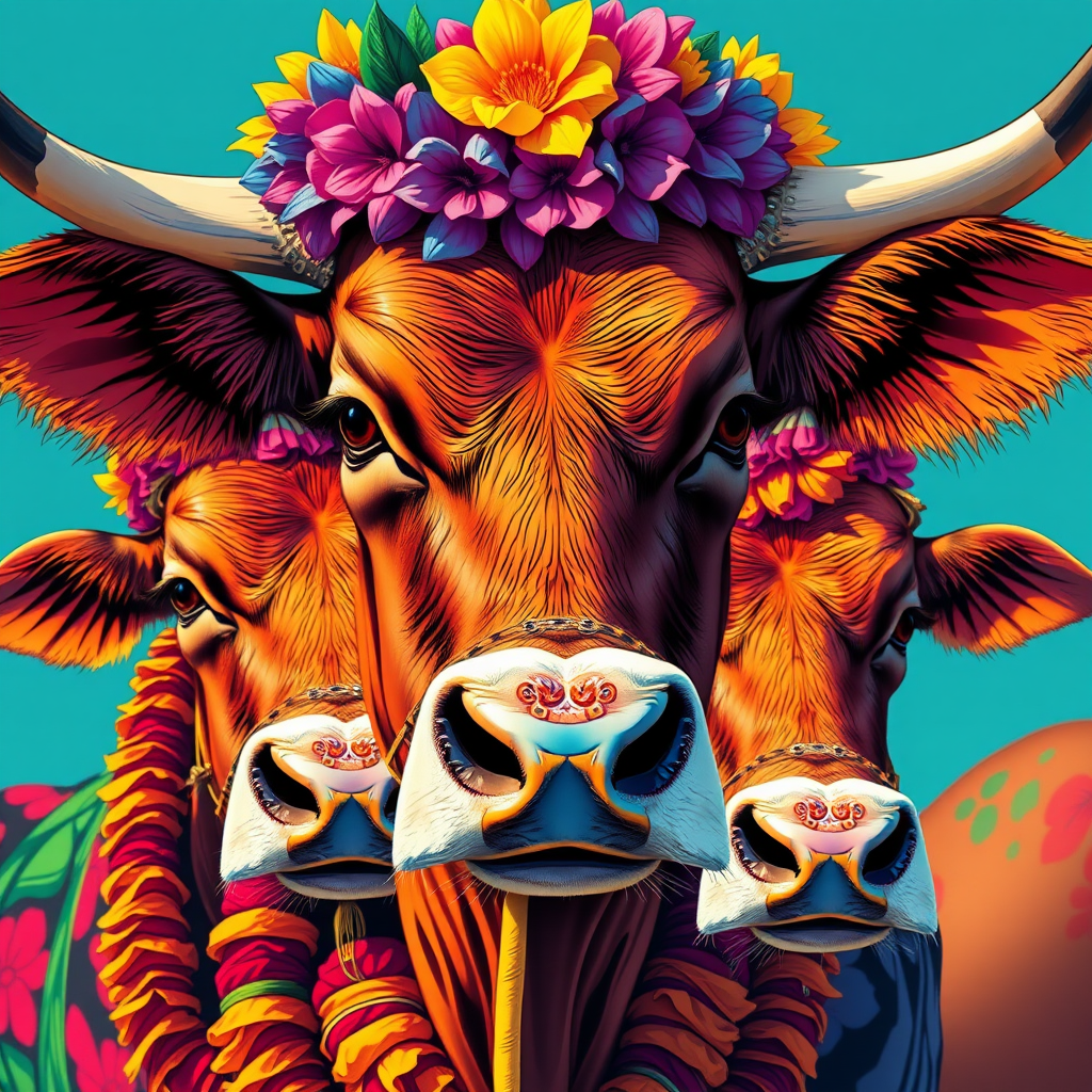 A modern portrait series of Nelore cattle adorned in vibrant, colorful attire, inspired by Hawaiian artists, depicted in an aggressive digital illustration style with bold shadows and airbrush techniques. The close-up artwork showcases a pop art color palette, rendered in ultra HD with comic art influences. Creative embellishments and subtle variations maintain the core concept while enhancing the visual narrative.
