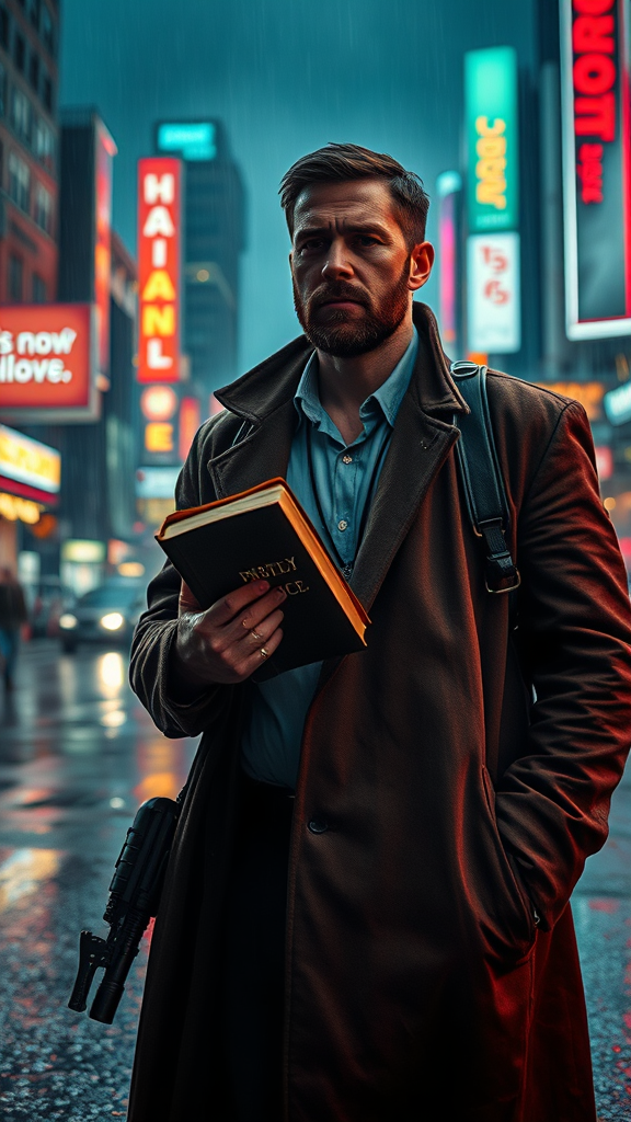 A modern preacher stands poised in the rain-soaked street of a dystopian city, illuminated by the flickering glow of neon billboards towering in the distance, reminiscent of a Blade Runner scene. The night is thick with an atmospheric fog, accentuating the preacher's solemn figure. In his hand, he clutches a weathered bible, its pages slightly worn with reverence. Over his shoulder, a sleek machine gun is slung, a juxtaposition of faith and survival in this gritty urban landscape. The preacher's coat flutters gently in the breeze, its fabric reflecting the kaleidoscope of neon colors. The scene captures the tension and hope of a hyper-realistic, cinematic moment in ultra 4k detail, where every drop of rain and each shimmer of light is vividly rendered.
