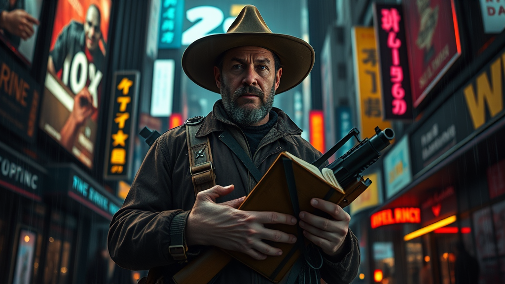 A modern preacher stands resolute in the heart of a dystopian city, enveloped by the glow of neon billboards that pierce the night like vibrant, electric sentinels, reminiscent of a Blade Runner scene. The air is thick with a sense of foreboding, as shadows dance across rain-slicked streets. Clad in layers of tattered yet resilient clothing, he exudes a paradoxical aura of both peace and defiance. In one hand, he firmly clutches a weathered bible, its pages whispering tales of hope and redemption. Slung over his shoulder is a sleek, menacing machine gun, an emblem of survival in this harsh world. His eyes, piercing and profound, reflect the vivid neon lights, revealing glimpses of untold stories. Above, a colossal holographic advertisement flickers, casting sporadic bursts of light that illuminate the preacher’s determined face, partially obscured by the brim of a broad hat. The atmosphere is cinematic, ultra-realistic in 4K, capturing the intricate contrast of spiritual solace and raw survival amidst the chaotic urban sprawl.