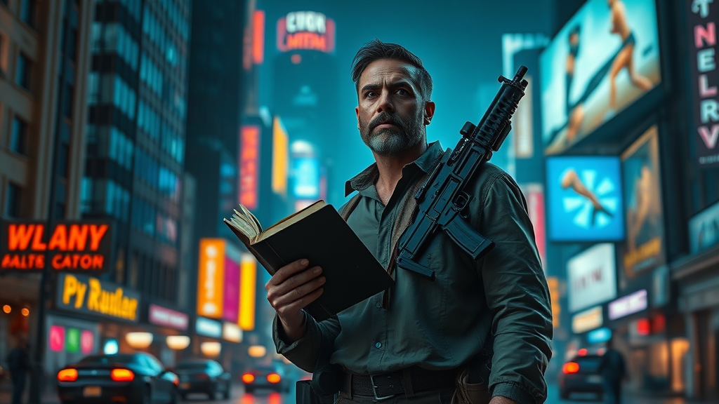 A modern preacher stands resolute in the neon-lit streets of a dystopian city under the cloak of night, reminiscent of a Blade Runner scene. His silhouette is striking against the vibrant glow of towering billboards that flicker and hum in the distance. Clad in weathered clothing that hints at years of turmoil, he grips a well-worn Bible in one hand, while a sleek, imposing machine gun is slung over his shoulder, merging the sacred with the profane. The rain-slicked streets reflect the kaleidoscope of colors emanating from the signs, casting an otherworldly sheen that dances around him. His eyes, sharp and discerning, survey the city with a mix of hope and defiance, embodying a paradox of faith and force in hyper-realistic detail, cinematic in its atmospheric intensity, captured in striking ultra 4k clarity.