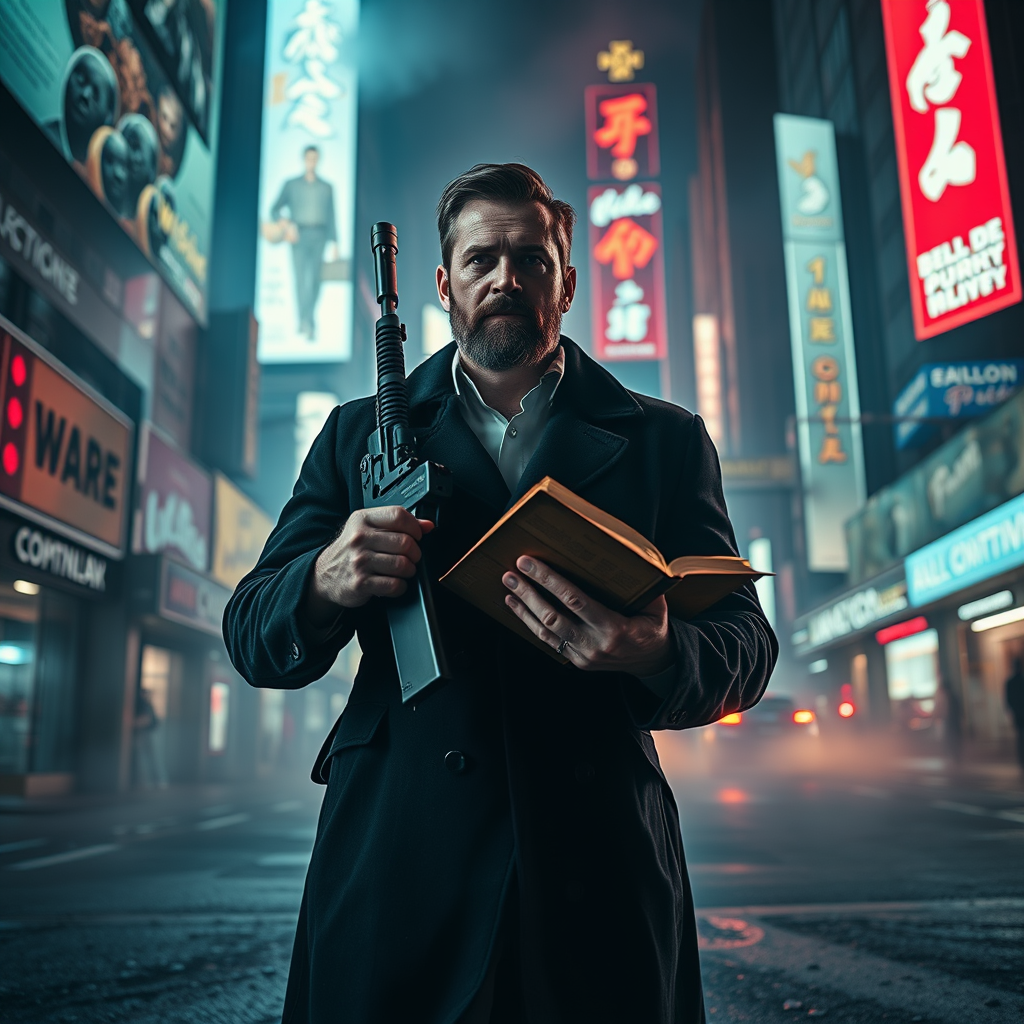 A modern preacher stands resolute in the neon-soaked streets of a dystopian city at night, his silhouette framed by towering, luminescent billboards reminiscent of a Blade Runner scene. The atmosphere is thick with cinematic tension and swirling mist, casting a dramatic glow on the gritty pavement. In one hand, he holds a well-worn Bible, its pages slightly crumpled and aged, while a sleek, formidable machine gun is strapped over his shoulder, glinting under the city lights. His expression is one of unwavering determination, as if his presence alone is a beacon of hope amidst the urban decay. The hyper-realistic details capture the essence of his mission, and the ultra 4K imagery brings every shadow and highlight into sharp relief, creating a scene that's both visually stunning and thought-provoking. The preacher's coat flutters slightly in the cool night breeze, adding a dynamic touch to this atmospheric tableau.
