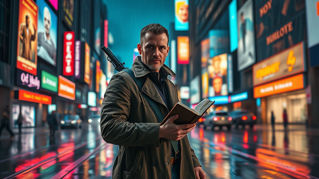 A modern preacher stands resolute in the rain-slicked streets of a dystopian city at night, neon billboards casting vibrant reflections across the wet pavement. His eyes, a beacon of calm yet fierce conviction, gaze past the array of towering, holographic advertisements reminiscent of a Blade Runner scene. Clad in a weathered trench coat fluttering in the electric breeze, he clutches a worn bible, its pages marked and dog-eared from use. Slung over his shoulder is a gleaming machine gun, a stark juxtaposition symbolizing protection and rebellion. The atmosphere is cinematic and atmospheric, the ultra 4k detail capturing every droplet of rain and every flicker of neon light. The urban landscape around him is alive with shadow and color, a hyper-realistic portrayal of a world teetering on the edge of chaos, yet holding a glimmer of faith in human redemption.