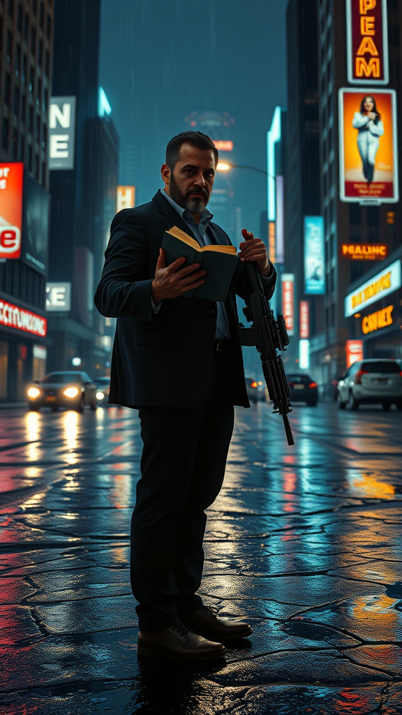 A modern preacher stands resolute on the rain-slicked streets of a dystopian city at night, where neon billboards flicker ominously like fragments of forgotten dreams. His silhouette is illuminated by the electric glow, casting long shadows that mingle with puddles on the cracked pavement. Clutched in one hand is a well-worn Bible, its pages whispering secrets of hope and redemption, while a sleek, futuristic machine gun is effortlessly slung over his shoulder, hinting at the paradox of faith and survival in these desolate times. His eyes, steely yet compassionate, peer through the haze of the midnight fog, embodying both a harbinger of salvation and a guardian against the chaos that lurks in the shadows. The cityscape is a testament to human ambition and downfall, creating a cinematic and atmospheric scene that encapsulates the preacher's solitary crusade in ultra-realistic, breathtaking 4k detail.