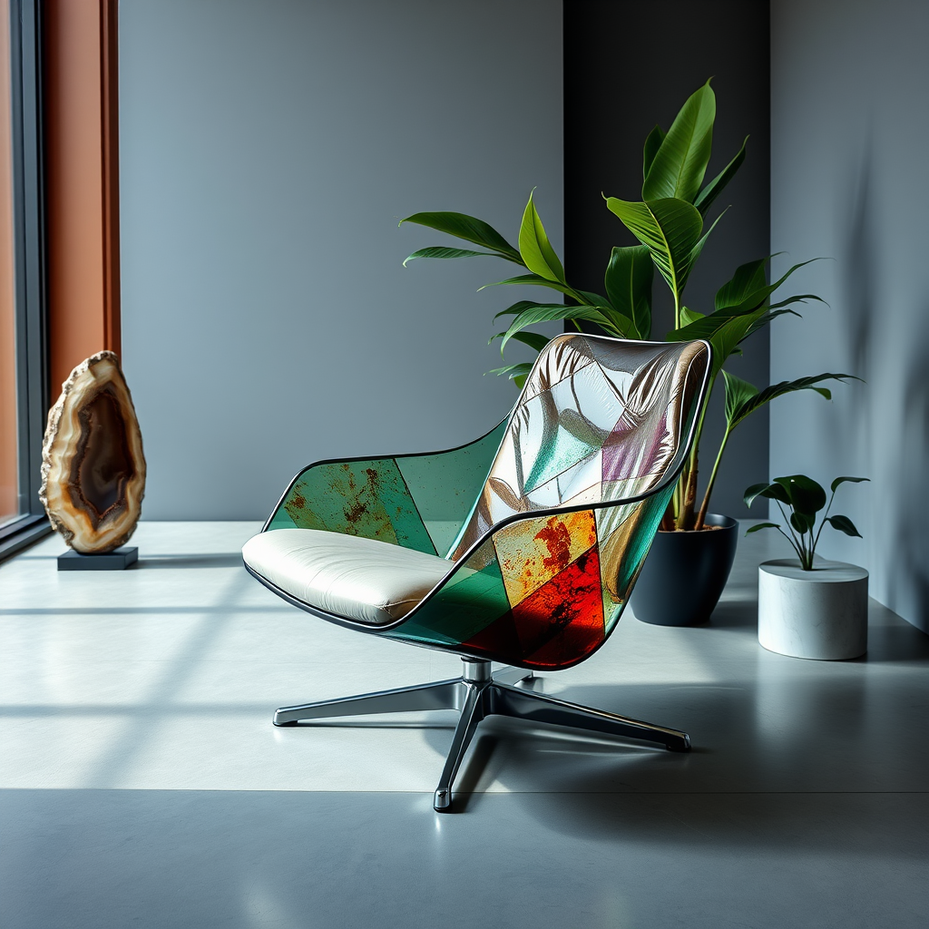 A modernist chair in a sleek studio setting, captured with a 90mm lens, featuring a sophisticated blend of steel and colorful glass textures, surrounded by a few lush plants and a minimalist onyx sculpture in the background.