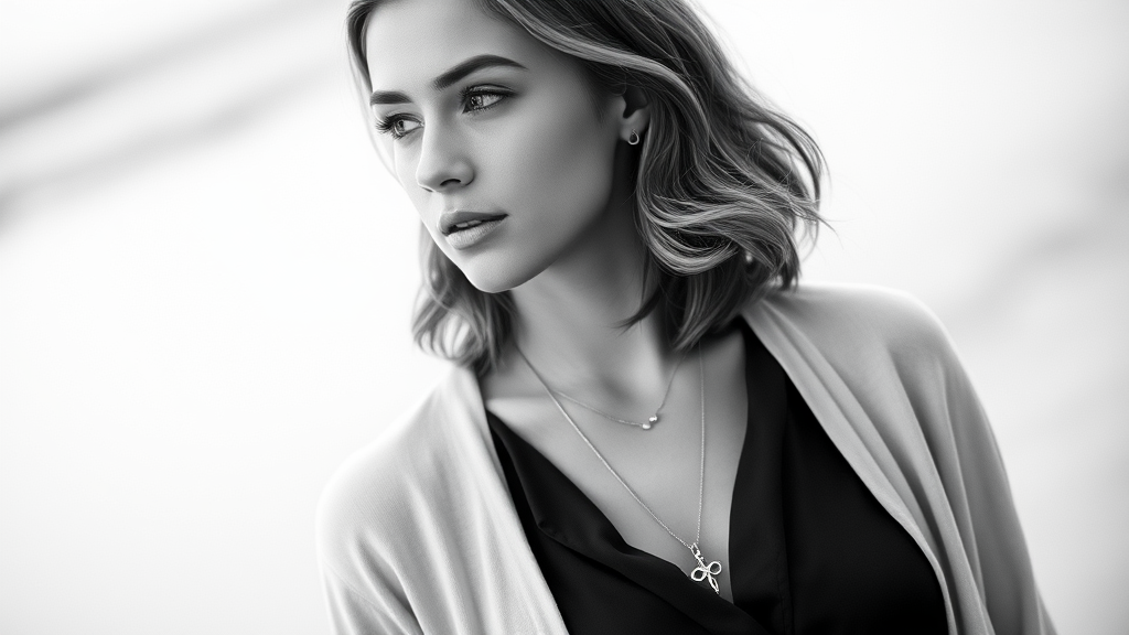 A monochromatic image features a young woman with shoulder-length wavy hair. She wears a stylish ensemble that includes an open light cardigan over a sleek dark blouse, highlighted by a simple necklace with an elegant pendant. Her minimal makeup subtly enhances her natural beauty, and her thoughtful gaze is angled softly toward the horizon. The image captures her understated elegance and reflective mood in black and white tones.