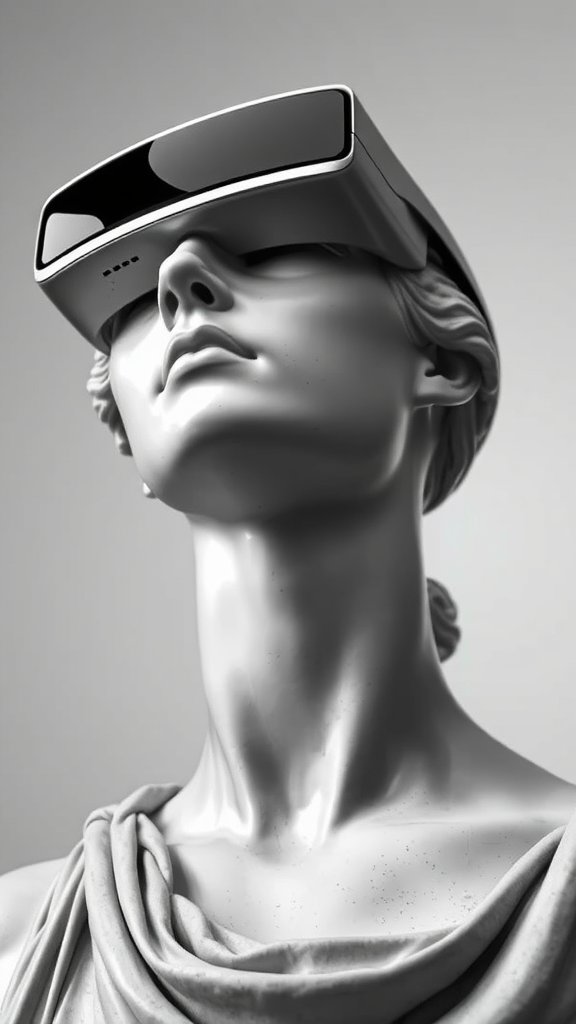 A monochromatic statue of a woman's head in a symmetrical composition, gazing upward while adorned with sleek, futuristic VR glasses. Her expression is serene and contemplative, capturing the intersection of classical beauty and modern technology. The minimalist texture of the statue contrasts with the polished, reflective surface of the VR glasses, creating an intriguing blend of past and future. Subtle variations in shading highlight the delicate features of the statue, adding depth and dimension to the monochrome palette. The overall atmosphere is one of elegance and innovation, inviting viewers to ponder the fusion of art and technology.