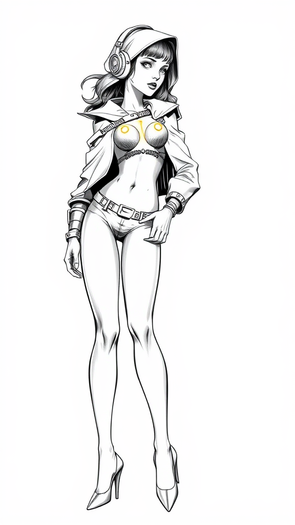 A monochromatic vector illustration of "Dr. Talos," depicted from a low camera angle with a full-body view in an asymmetrical diagonal profile. Inspired by the style of Philip Bond, the artwork features dithered shading and inked outlines typical of comic book drawings. Dr. Talos is a female character with hyperrealism detail set against a white background. Her design includes unique characteristics such as glowing elements on her chest and a piercing presence. She wears headphones and a hood, and her form is accentuated by bright, almost blinding light. The character's physique is skinny with narrow hips and high heels. Her attire and overall design incorporate elements of gold and rivets, adding an industrial touch. Despite the complex design, the facial features and body maintain a cohesive appearance, emphasizing a single, intriguing expression with clear anatomy and balanced proportions. Floating elements and mechanical details are part of her design, but carefully integrated to avoid overtly mutated or distorted features. The overall image captures an avant-garde comic book aesthetic without stepping into grotesque or unfinished territory.