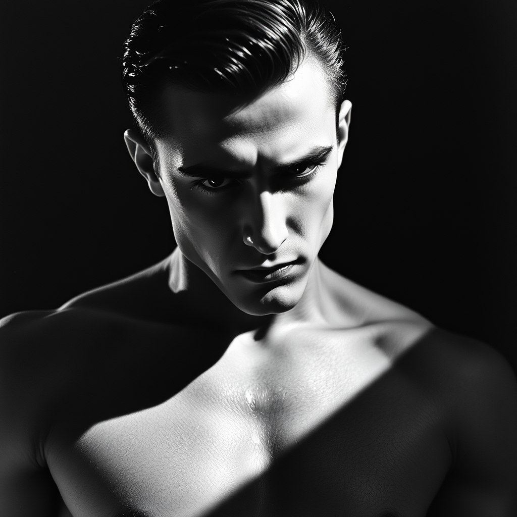 A monochrome image capturing a dashing young man with chiseled abs, evoking the cinematic style of Fritz Lang, with a touch of vintage noir charm and an enigmatic expression set against a backdrop of shadows and light play.