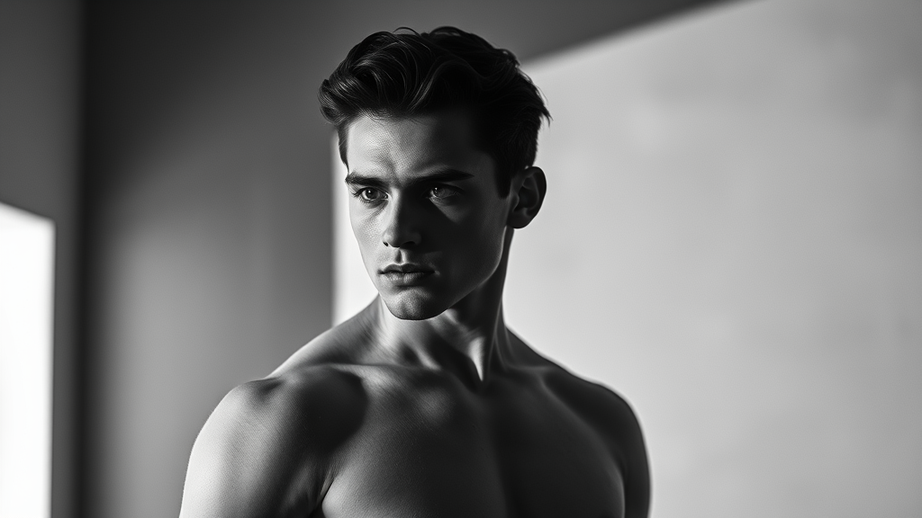 A monochrome image capturing a strikingly handsome young man with defined abs, evoking the cinematic style of Fritz Lang with a dramatic play of light and shadow, his confident posture and intense gaze suggest a story untold, set against a minimalist backdrop that enhances the timeless, mysterious allure.