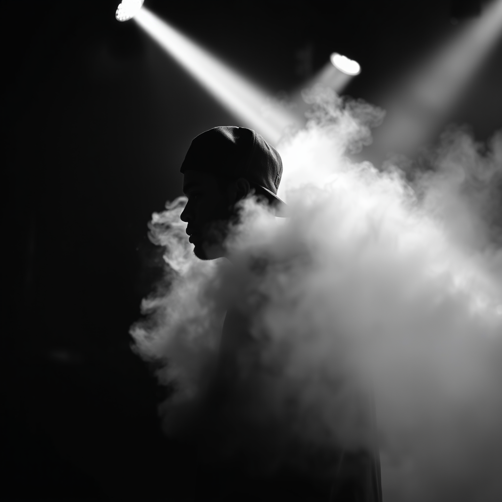 A monochrome photograph capturing a hip-hop artist wearing a baseball cap, emerging dramatically from swirling mist on stage during a live performance, viewed from the side. The scene is illuminated with intense, volumetric lighting, creating a striking cinematic effect with dynamic angles and bold shadows.