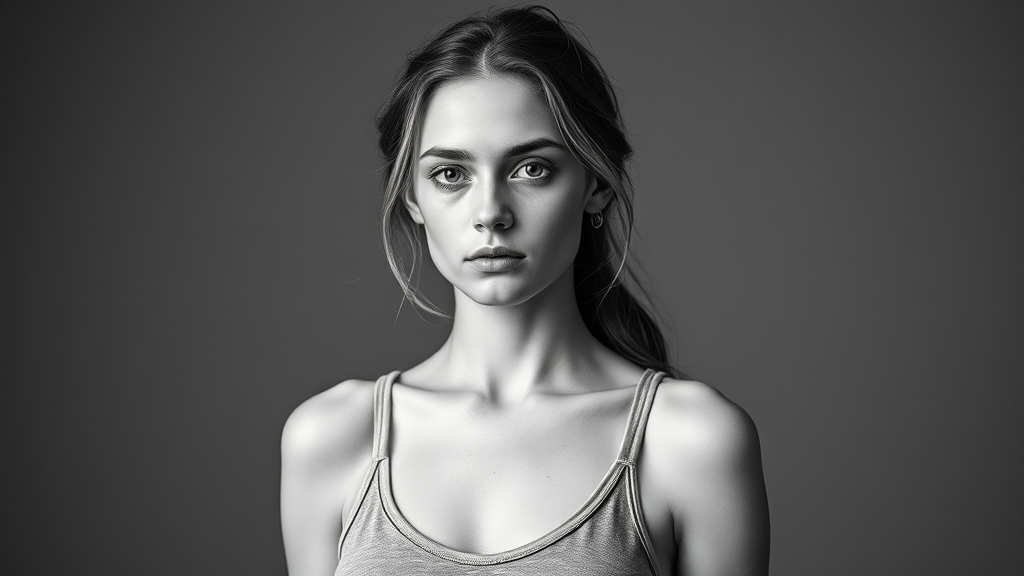 A monochrome photograph capturing a young, slender Ukrainian woman in a tank top, styled reminiscent of Alasdair McLellan's work. She exudes a tomboyish charm, with pretty long hair and a hint of Julia Garner's features. Her skin glistens with sweat, conveying a raw, natural energy. The composition emphasizes her full height, evoking the style of a vintage daguerreotype, set against a subtly textured, flat grey background. The image embodies a timeless, archival quality, much like a classic supermodel portrait in a full-page magazine layout.