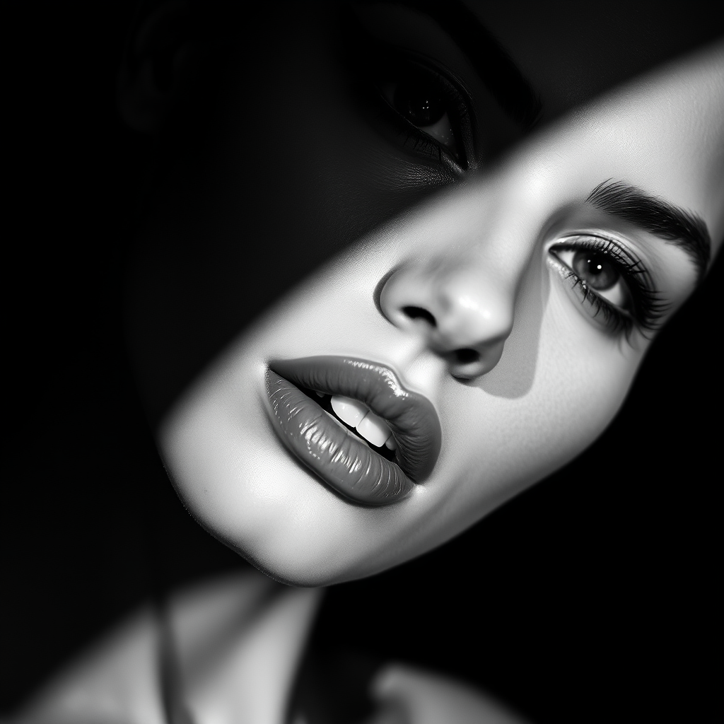 A monochrome photograph capturing the striking face of an alluring woman, emphasizing her lips, artfully highlighted by deep shadows, crafted for an advertising or fashion magazine cover, featuring high contrast and minimalist elegance. The image embodies a mysterious, modern style with an artistic, iconic, and stylish allure. It presents a simple yet stylized beauty that is both captivating and powerful, with a strong, impactful presence, resonating with a minimalist aesthetic.