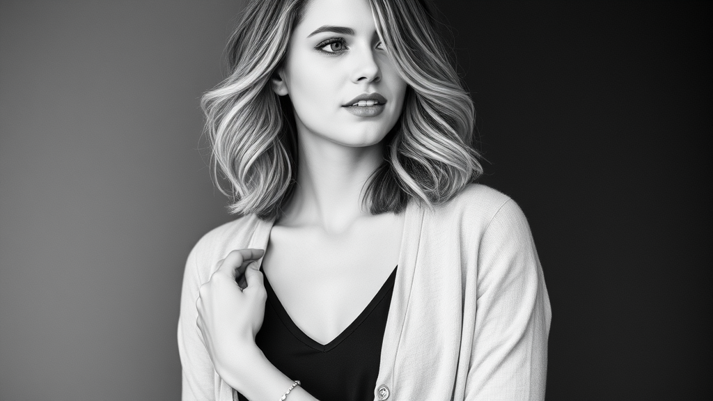 A monochrome photograph portrays a young woman with shoulder-length wavy hair. She is dressed in a chic, relaxed ensemble featuring an open, light-colored cardigan over a fitted dark blouse, accented with a subtle bracelet on her wrist. Her makeup is understated, highlighting her natural beauty, and her expression is thoughtful, her eyes gazing gently into the distance. The image captures her innate grace with a timeless, black and white aesthetic.