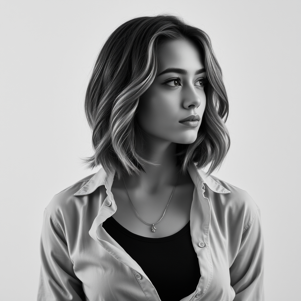A monochrome portrait captures a young woman with medium-length, softly wavy hair. Her ensemble is effortlessly chic, featuring an unbuttoned, light-colored blouse draped over a fitted, dark tee. A dainty necklace with a tiny charm rests at her collarbone. Her makeup is understated, highlighting her refined features as her eyes, lost in thought, gaze gently to the side. The grayscale tones of the image enhance her innate grace and poise.