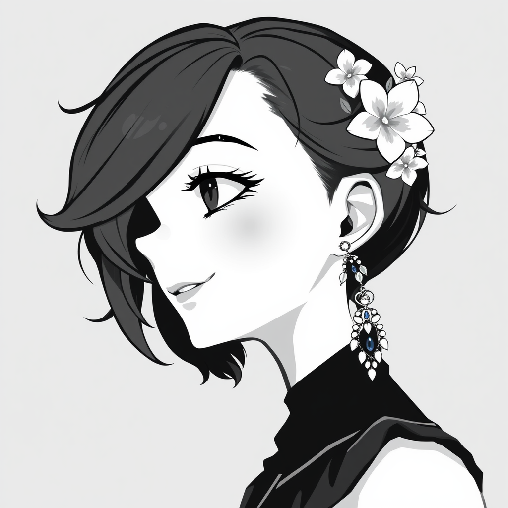A monochrome portrait of a girl with a light smile, featuring a facial mark, parted lips, and delicate teeth, set against a grey background. Her profile shows her looking to the side with her nose gracefully outlined. Her hair is styled to the side, adorned with flowers, while she wears elegant earrings that add a touch of jewelry to the scene. Inspired by the character of Dark Willow from Dota 2, the image captures a sense of whimsical charm and mystery.