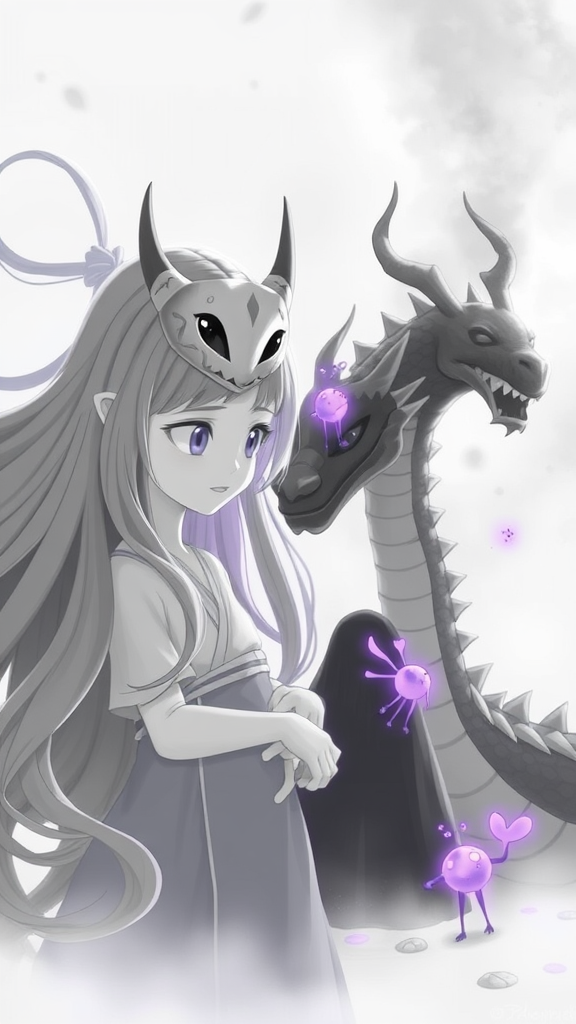 A monochrome scene featuring characters from Spirited Away, where soft grayscale tones dominate, but with subtle touches of ethereal purple highlighting select features. The spirited essence of Chihiro is enhanced by a gentle lavender hue in her flowing hair, while the mysterious No-Face is adorned with a delicate amethyst glow emanating from his mask's markings. Haku's dragon scales glisten with hints of violet, adding a mystical aura to his presence, and the soot sprites are playfully accentuated with faint lilac sparkles as they dance around. The overall atmosphere is dreamlike, with the purple accents breathing life into the black and white world.