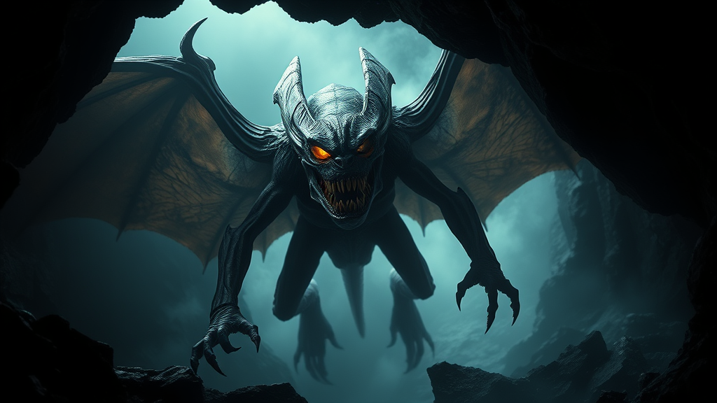 A monstrous alien entity with large, leathery bat-like wings unfolds from the depths of a mist-cloaked cave. Its body is covered in dense, dark fur, and its elongated limbs are tipped with menacing claws. The creature's grotesque visage features a predator's gaping maw filled with dagger-like teeth, while its glowing, fiery orange eyes pierce through the gloom. This horrifying spectacle is captured in intricate, photorealistic detail, with dramatic, cinematic lighting highlighting every nuance of its terrifying form. The scene exudes a chilling atmosphere, enhanced by subtle cinematic noise, all rendered in stunning 8k resolution.
