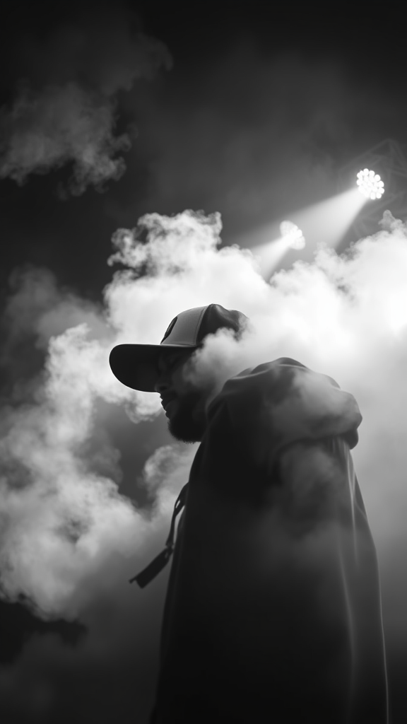 A moody black and white photograph captures a rapper wearing a baseball cap, partially emerging from a dense, swirling fog on stage during a high-energy concert. The image, taken from a dramatic side view, showcases volumetric lighting that enhances the atmospheric effect, with shadows and highlights creating a dynamic, cinematic angle. The stage lights cast a contrasting interplay of brightness and darkness, emphasizing the intense and raw energy of the performance.