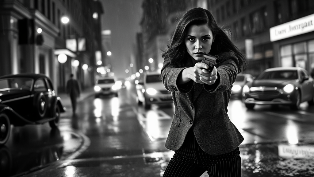 A moody black and white scene set in the rain-slicked streets of a 1940s noir city. A high-contrast film captures the intense gunfight, as a stunning detective with long, shiny hair and freckles expertly dodges bullets. Her dark, reflective eyes hold a fierce determination, accentuated by dramatic makeup. She wears fitted pinstripe trousers and a classic tweed jacket, her form lit by dramatic rim lighting that highlights the mist and fog swirling around her. Glass shatters spectacularly as shots ring out, the sound echoing off wet pavement. Dust particles are caught in the focused streetlights, adding depth. In the background, the blurred forms of modern cars pass by, incongruent in this timeless scene. Through shallow focus, we catch glimpses of period-appropriate street elements and notice the scattered contents of a detective's office—weathered canvases and a vintage typewriter. Yet, the mood leans heavily on the imperfections of detailed lighting and noir aesthetic, bringing to life the tension of this vintage, action-packed tableau.