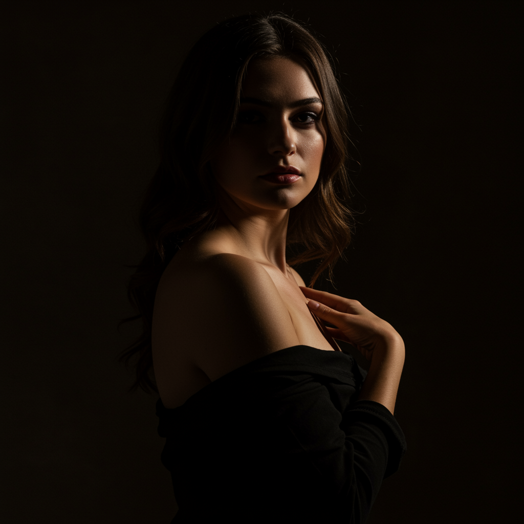 A moody fine art portrait of a woman exuding quiet confidence, enveloped by a deep, shadowy background. Soft, directional lighting accentuates her figure, casting a painterly glow over her skin that highlights its subtle textures and contours. Shadows play artfully across her face, partially concealing her expression and imbuing her with an enigmatic allure. Her stance is a blend of power and grace, projecting both inner strength and natural beauty. The composition embraces rich, low-key lighting, with carefully placed highlights that draw attention to her form amidst the obscured backdrop. The background merges into darkness, allowing her silhouette to command attention, embodying a sense of timeless elegance and cinematic depth.