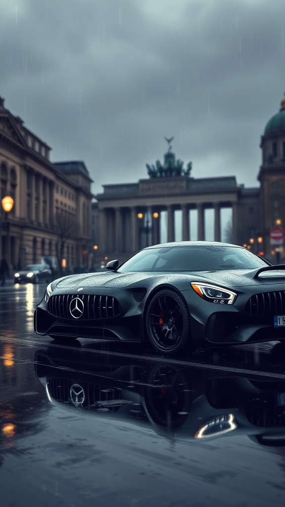 A moody, high-speed illustration of a sleek Black Mercedes Benz AMG GT4, parked on a deserted, wet-section of the Reichstag boulevard in Berlin, Germany, at noon on a stormy day, with rain pouring down from a dark grey sky, casting a subtle rainbow on the wet asphalt, ultra-realistic, ultra-detailed, 8K resolution, HDR-enabled, rendered using Octane's advanced simulation capabilities, showcasing the car's aggressive stance, glistening raindrops, and reflected light on the wet surface, in a 16:9 aspect ratio, with an artistic take on the surrounding architecture, subtle reflections in nearby windows, and a hint of movement blurred in the background.