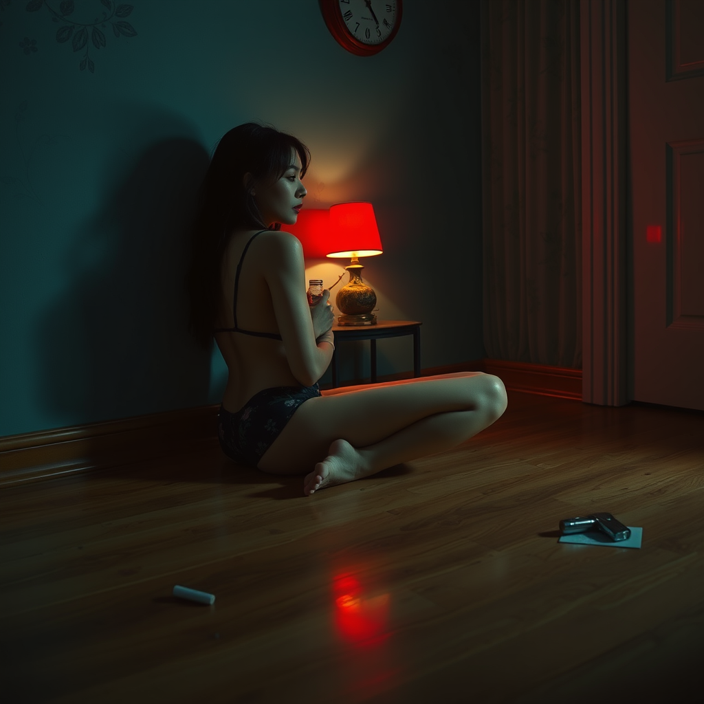 A moody, hyper-realistic cinematic scene of a woman sitting cross-legged on a polished wooden floor in a softly illuminated room. She exudes a serene calmness, her dark, floral-patterned lingerie complementing her relaxed demeanor. Her back rests gently against the teal-painted wall, an empty glass bottle cradled in her hand. Beside her, a small vintage red lamp emits a gentle, warm glow, casting intricate shadows and amplifying her silhouette. The wallpaper behind her bears a delicate floral motif, adding a rich texture to the minimalistic setting. Above her, a colorful wall clock ticks quietly, suggesting the passage of time. Small details—a burnt cigarette butt and a silver lighter nearby—enhance the mood of solitude and reflection. The subdued color palette, comprised of muted hues, allows the red light and deep shadows to create striking contrast and depth. This scene is a contemplative fine art photograph capturing a moment of quiet introspection and urban solitude.