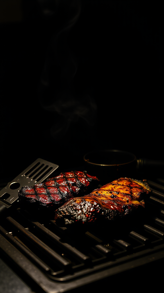 A moody photograph capturing a grill under dim lighting, where shadows accentuate an array of grilling tools alongside a succulent piece of barbecued meat, enhancing its rich textures and smoky essence.