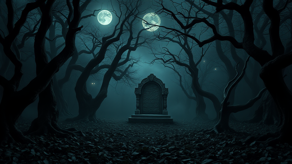 A moonlit forest shrouded in mist, twisted trees with gnarled branches reaching out like skeletal hands, shadows lurking between the trunks, illuminated eyes glimmering from the darkness, the ground covered in a carpet of withered leaves, an ancient, crumbling stone altar at the forest's center, surrounded by flickering ghostly lights.