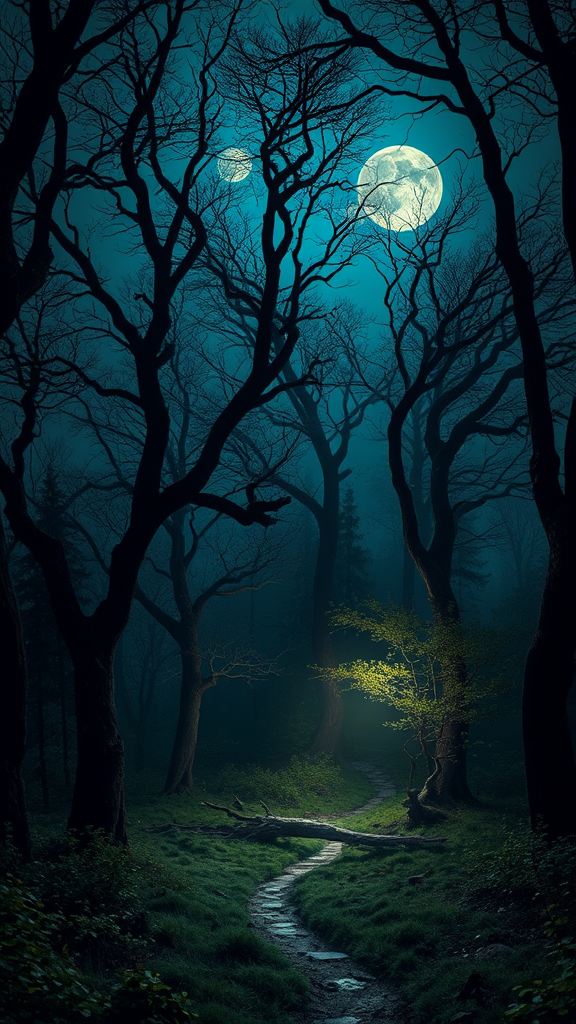 A moonlit forest where ancient trees whisper secret tales, and a hidden path emerges under the shimmering glow.