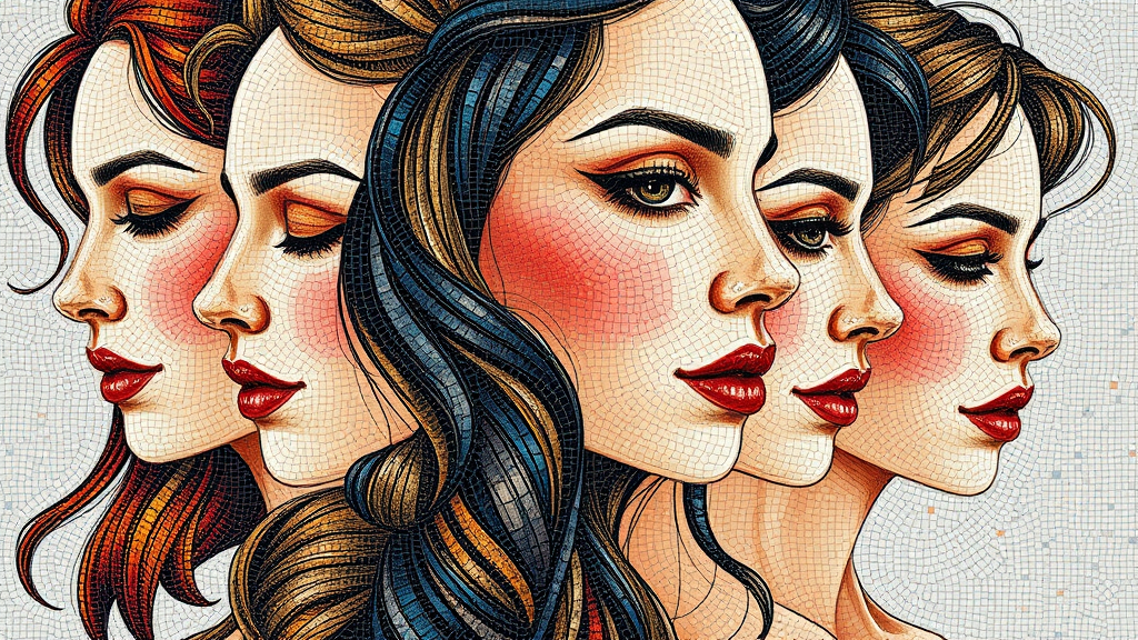 A mosaic collage of women's faces, seamlessly integrated, capturing the elegant and expressive style of Andrew Atroshenko, infused with the intricate, surreal elements reminiscent of Peter Gric. The faces display a spectrum of emotions, blending harmoniously within an elongated vertical format, enhancing their ethereal beauty. The composition radiates a gentle yet dynamic energy, characterized by fluid lines and vivid colors that bring the mosaic to life, embodying a dreamlike quality with a touch of abstract sophistication.