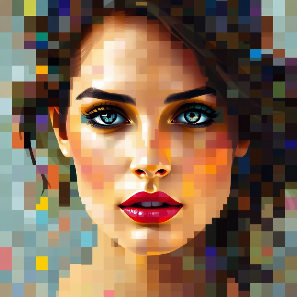 A mosaic of vibrant colors forming an abstract portrait of a woman's face, capturing the essence of elegance and mystery with softly blurred features.