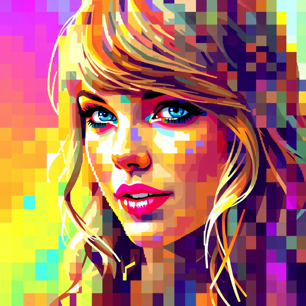 A mosaic of vibrant colors forms an abstract portrait of Taylor Swift, her recognizable features subtly blended with a kaleidoscope of pixels.