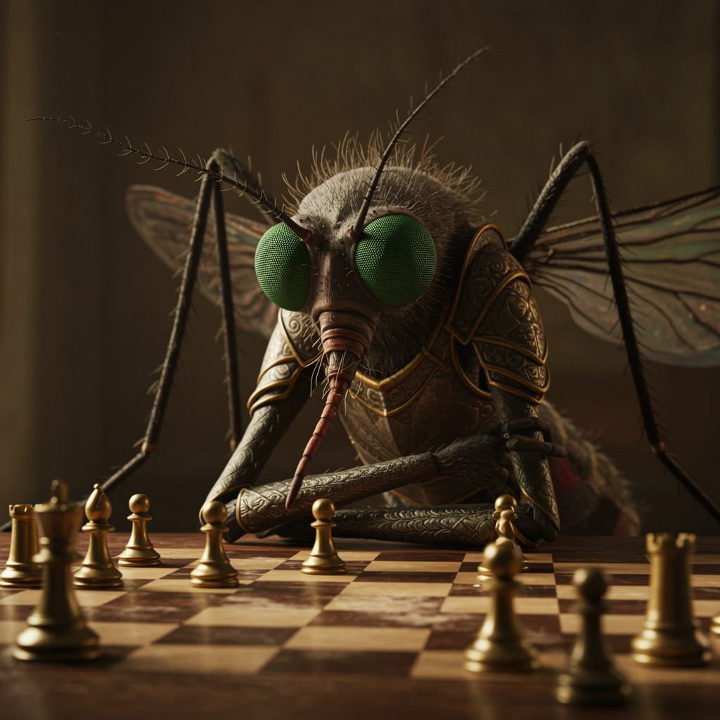 A mosquito with big green eyes, clad in intricate armor, sitting at a table engrossed in a game of chess, the scene cinematic and richly detailed, capturing the tension and strategy in the insect's expression.