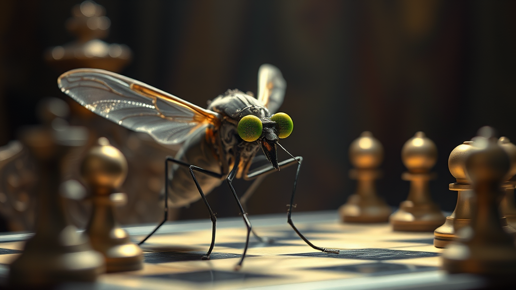 A mosquito with big green eyes sits at a table engaged in a game of chess. Its delicate wings shimmer subtly, reflecting the soft light around. Clad in intricate armor resembling ancient knights, the mosquito stands poised and thoughtful, its slender legs touching the chess board with precision. The scene is richly detailed, capturing the contrast between the mosquito's natural elegance and the ornate medieval armor. The dramatic, cinematic ambiance is further accentuated by the play of shadows and light, every groove and curve of the armor finely detailed, highlighting the surreal yet captivating portrait of a tiny insect in a grandiose setting.
