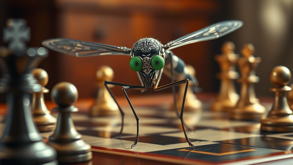 A mosquito with large, emerald green eyes sits on a polished wooden table, deeply engrossed in a game of chess. Its delicate wings glint under soft, cinematic lighting as it surveys the chessboard with an air of strategic contemplation. The mosquito is adorned in intricate, silver armor that gleams with finely detailed etchings, giving it an imposing yet majestic presence. The surrounding atmosphere is rich with detail, capturing the intensity of the game as each piece on the board is poised for action.