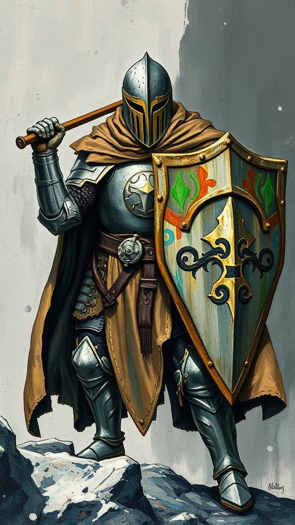 A mottled knight in armor, brandishing a shield and flowing cloak, depicted in the adventurous and bold style of pulp illustration. The illustration is textured with heavy use of palette knives, blending dark white and metallic bronze hues with hints of indigenous Yup'ik art patterns. Accents of light indigo and vibrant green weave through the image, creating a vivid contrast. Styled within a vertical 1:2 aspect ratio, the artwork embodies an evocative blend of tradition and modernity, reflecting the aesthetic trends from 1970 to the present with a high level of stylization.