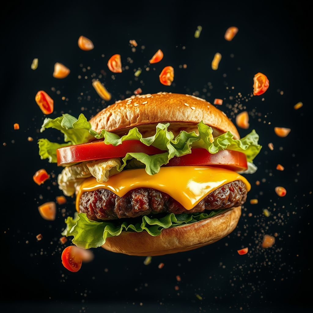 A mouth-watering burger bursting apart in mid-air, layers of fresh ingredients tumbling with tantalizing detail; the juicy patty glistens against the cheese as crispy lettuce and ripe tomato slice scatter, all captured in a dramatic, cinematic style. The image showcases intricate textures with HDR precision, enhanced in Adobe Lightroom to highlight every sumptuous element, creating a visually stunning and appetizing scene.