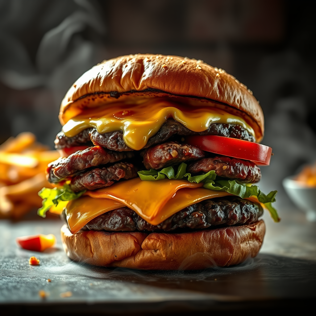 A mouth-watering burger tumbling apart, showcasing layers of juicy, flavorful ingredients, captured in a steamy, enticing promotional image. Every element rendered with intricate details and dramatic highlights, presented in stunning HDR quality. The scene is bathed in cinematic lighting, reminiscent of a masterpiece crafted in Adobe Lightroom, emphasizing the burger's vibrant colors and textures.
