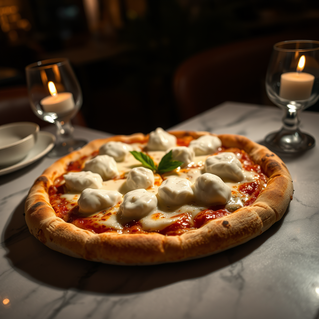 A mouth-watering, close-up shot of a luxuriously indulgent sourdough pizza topped with extra creamy mozzarella, captured in the style of high-end food photography. The elegant, gourmet scene features a centered composition, accentuated by dramatic lighting that casts soft, directional shadows, enhancing the tempting textures of the melted cheese. The setting evokes an evening ambiance within an interior location, styled meticulously by a food stylist. Captured using a Nikon Z7 with a 105mm lens, the image highlights the pizza’s flawless presentation—clean, refined, and irresistibly appetizing.