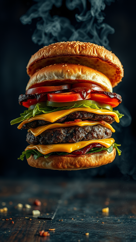A mouthwatering burger captured in mid-air as it deconstructs into layers, with succulent, flavorful, steaming ingredients highlighted in a promotional photograph, showcasing intricate details and a high dynamic range, evoking a cinematic feel through expert editing in Adobe Lightroom, with an emphasis on highly detailed textures and vibrant colors.