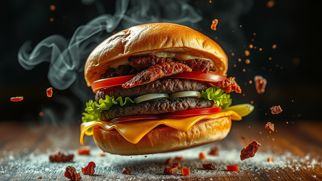 A mouthwatering burger disassembling in mid-air, each component showcasing rich, vibrant textures and colors; sizzling and alluring with steam rising, captured in a promotional photo featuring delicate elements, cinematic flair, and crafted to perfection using Adobe Lightroom, with an emphasis on intricate details and high dynamic range.